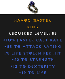 Required Level: 88+10% Faster Cast Rate+22 to Strength+12 to Dexterity+85 to Attack Rating+19 to Life1% Life stolen per hit