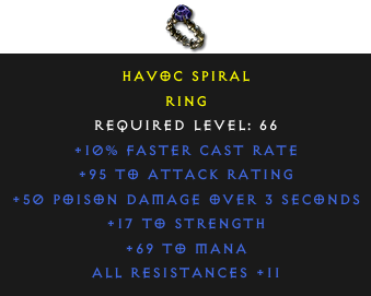 Required Level: 66+10% Faster Cast Rate+17 to StrengthAll Resistances +11+95 to Attack Rating50 Poison Damage over time+69 to Mana