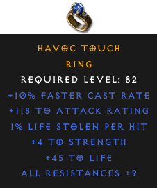 Required Level: 82+10% Faster Cast Rate+4 to StrengthAll Resistances +9+118 to Attack Rating+45 to Life1% Life stolen per hit
