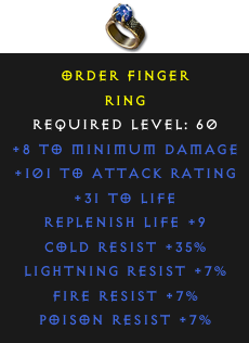 Required Level: 60Replenish Life +9+101 to Attack Rating+31 to LifePoison Resist +7%Cold Resist +35%Lightning Resist +7%Fire Resist +7%+8 to Minimum Damage