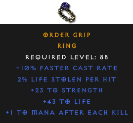 Required Level: 88+10% Faster Cast Rate+23 to Strength+43 to Life+1 to Mana after each Kill2% Life stolen per hit