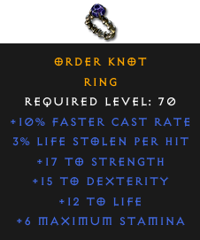Required Level: 70+10% Faster Cast Rate+17 to Strength+15 to Dexterity+12 to Life3% Life stolen per hit+6 Maximum Stamina