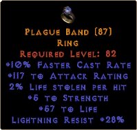 Required Level: 82+10% Faster Cast Rate+117 to Attack Rating2% Life stolen per hit+5 to Strength+57 to LifeLightning Resist +28%