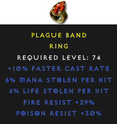 Required Level: 74+10% Faster Cast RatePoison Resist +30%Fire Resist +29%6% Life stolen per hit6% Mana stolen per hit