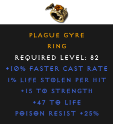 Required Level: 82+10% Faster Cast Rate+15 to Strength+47 to LifePoison Resist +25%1% Life stolen per hit