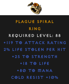 Required Level: 88+25 to Strength+119 to Attack Rating+18 to LifeCold Resist +10%2% Life stolen per hit+80 to Mana