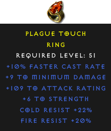 Required Level: 51+10% Faster Cast Rate+6 to Strength+109 to Attack RatingCold Resist +22%Fire Resist +20%+9 to Minimum Damage