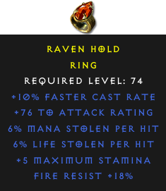 Required Level: 74+10% Faster Cast Rate+76 to Attack RatingFire Resist +18%6% Life stolen per hit6% Mana stolen per hit+5 Maximum Stamina