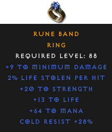 Required Level: 88+20 to Strength+13 to LifeCold Resist +28%2% Life stolen per hit+9 to Minimum Damage+64 to Mana