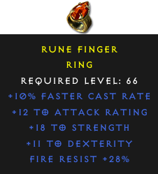 Required Level: 66+10% Faster Cast Rate+18 to Strength+11 to Dexterity+12 to Attack RatingFire Resist +28%