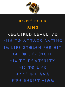 Required Level: 70+4 to Strength+14 to Dexterity+112 to Attack Rating+13 to LifeFire Resist +10%1% Life stolen per hit+77 to Mana