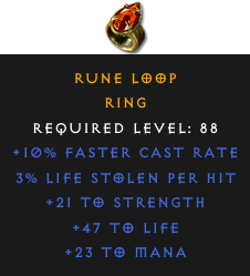 Required Level: 88+10% Faster Cast Rate+21 to Strength+47 to Life3% Life stolen per hit+23 to Mana