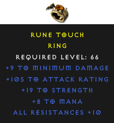 Required Level: 66+19 to StrengthAll Resistances +10+105 to Attack Rating+9 to Minimum Damage+8 to Mana