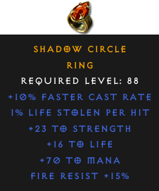 Required Level: 88+10% Faster Cast Rate+23 to Strength+16 to LifeFire Resist +15%1% Life stolen per hit+70 to Mana