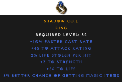 Required Level: 82+10% Faster Cast Rate+3 to Strength+45 to Attack Rating8% Better Chance of Getting Magic Items+56 to Life2% Life stolen per hit