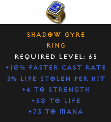 Required Level: 65+10% Faster Cast Rate+4 to Strength+50 to Life3% Life stolen per hit+73 to Mana