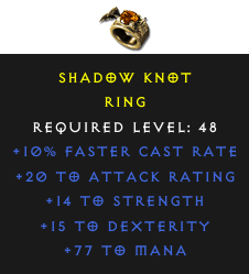 Required Level: 48+10% Faster Cast Rate+14 to Strength+15 to Dexterity+20 to Attack Rating+77 to Mana