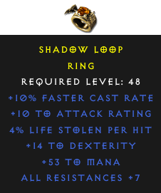 Required Level: 48+10% Faster Cast Rate+14 to DexterityAll Resistances +7+10 to Attack Rating4% Life stolen per hit+53 to Mana