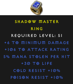 Required Level: 51+106 to Attack Rating+30 to LifePoison Resist +10%Cold Resist +10%5% Mana stolen per hit+6 to Minimum Damage