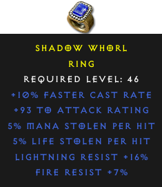 Required Level: 46+10% Faster Cast Rate+93 to Attack RatingLightning Resist +16%Fire Resist +7%5% Life stolen per hit5% Mana stolen per hit