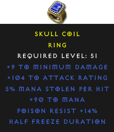 Required Level: 51+104 to Attack RatingPoison Resist +14%Half Freeze Duration5% Mana stolen per hit+9 to Minimum Damage+90 to Mana
