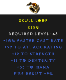 Required Level: 48+10% Faster Cast Rate+12 to Strength+11 to Dexterity+99 to Attack RatingFire Resist +9%+53 to Mana