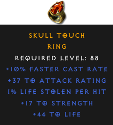 Required Level: 88+10% Faster Cast Rate+17 to Strength+37 to Attack Rating+44 to Life1% Life stolen per hit