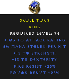 Required Level: 74+15 to Strength+13 to Dexterity+103 to Attack RatingPoison Resist +25%Fire Resist +25%6% Mana stolen per hit