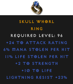 Required Level: 96+2 to Strength+24 to Attack Rating+10 to LifeLightning Resist +23%11% Life stolen per hit6% Mana stolen per hit