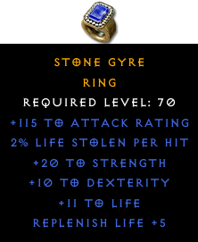 Required Level: 70+20 to Strength+10 to DexterityReplenish Life +5+115 to Attack Rating+11 to Life2% Life stolen per hit