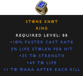 Required Level: 88+10% Faster Cast Rate+25 to Strength+49 to Life+1 to Mana after each Kill2% Life stolen per hit