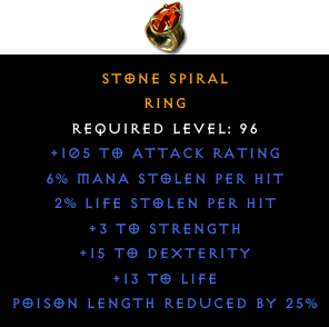 Required Level: 96+3 to Strength+15 to Dexterity+105 to Attack Rating+13 to LifePoison Length Reduced by 25%2% Life stolen per hit6% Mana stolen per hit