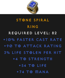 Required Level: 82+10% Faster Cast Rate+4 to Strength+90 to Attack Rating+54 to Life3% Life stolen per hit+74 to Mana