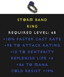Required Level: 48+10% Faster Cast Rate+13 to DexterityReplenish Life +6+98 to Attack RatingCold Resist +19%+84 to Mana