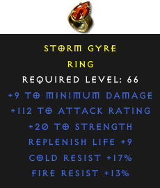 Required Level: 66+20 to StrengthReplenish Life +9+112 to Attack RatingCold Resist +17%Fire Resist +13%+9 to Minimum Damage