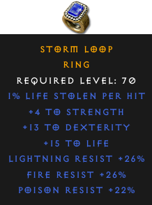 Required Level: 70+4 to Strength+13 to Dexterity+15 to LifePoison Resist +22%Lightning Resist +26%Fire Resist +26%1% Life stolen per hit