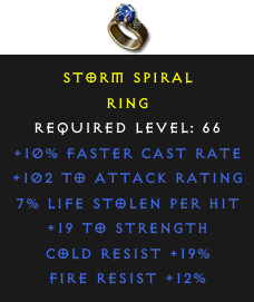 Required Level: 66+10% Faster Cast Rate+19 to Strength+102 to Attack RatingCold Resist +19%Fire Resist +12%7% Life stolen per hit