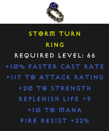 Required Level: 66+10% Faster Cast Rate+20 to StrengthReplenish Life +9+117 to Attack RatingFire Resist +22%+10 to Mana