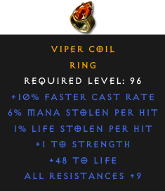 Required Level: 96+10% Faster Cast Rate+1 to StrengthAll Resistances +9+48 to Life1% Life stolen per hit6% Mana stolen per hit