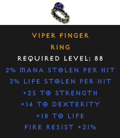 Required Level: 88+25 to Strength+14 to Dexterity+18 to LifeFire Resist +21%3% Life stolen per hit2% Mana stolen per hit