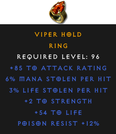 Required Level: 96+2 to Strength+85 to Attack Rating+54 to LifePoison Resist +12%3% Life stolen per hit6% Mana stolen per hit