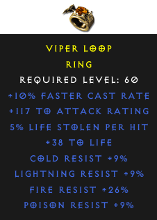 Required Level: 60+10% Faster Cast Rate+117 to Attack Rating+38 to LifePoison Resist +9%Cold Resist +9%Lightning Resist +9%Fire Resist +26%5% Life stolen per hit