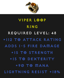 Required Level: 48+15 to Strength+15 to Dexterity+112 to Attack RatingLightning Resist +18%Adds Fire Damage+90 to Mana