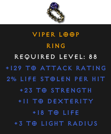Required Level: 88+23 to Strength+11 to Dexterity+129 to Attack Rating+18 to Life+3 to Light Radius2% Life stolen per hit