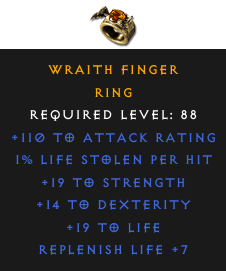 Required Level: 88+19 to Strength+14 to DexterityReplenish Life +7+110 to Attack Rating+19 to Life1% Life stolen per hit