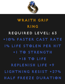 Required Level: 63+10% Faster Cast Rate+1 to StrengthReplenish Life +9+18 to LifeLightning Resist +27%Half Freeze Duration1% Life stolen per hit