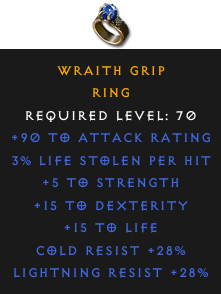 Required Level: 70+5 to Strength+15 to Dexterity+90 to Attack Rating+15 to LifeCold Resist +28%Lightning Resist +28%3% Life stolen per hit