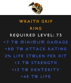 Required Level: 73+3 to Strength+13 to Dexterity+80 to Attack Rating+48 to Life2% Life stolen per hit+7 to Minimum Damage