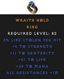 Required Level: 82+5 to Strength+11 to DexterityAll Resistances +10+51 to Life3% Life stolen per hit+59 to Mana