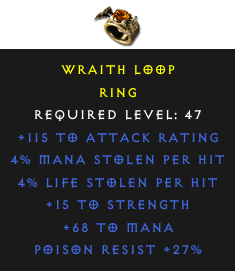 Required Level: 47+15 to Strength+115 to Attack RatingPoison Resist +27%4% Life stolen per hit4% Mana stolen per hit+68 to Mana